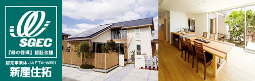 人にやさしい住まいづくり『基準は赤ちゃん』を追求すると、自然環境にもやさしい住まいになりました。 新産住拓は、森林認証材(SGEC)の活用や木材の自然乾燥にこだわり、国産材の活用を通じて日本の山を守り、環境にやさしい木材の利用に取り組んでいます。